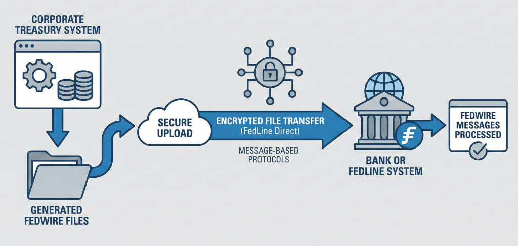 Corporate or bank treasury systems can also generate files containing multiple Fedwire transfers, and upload or send them to a bank or FedLine system. Banks using FedLine services exchange Fedwire messages via encrypted file transfers (e.g., via FedLine Direct) or message-based protocols.