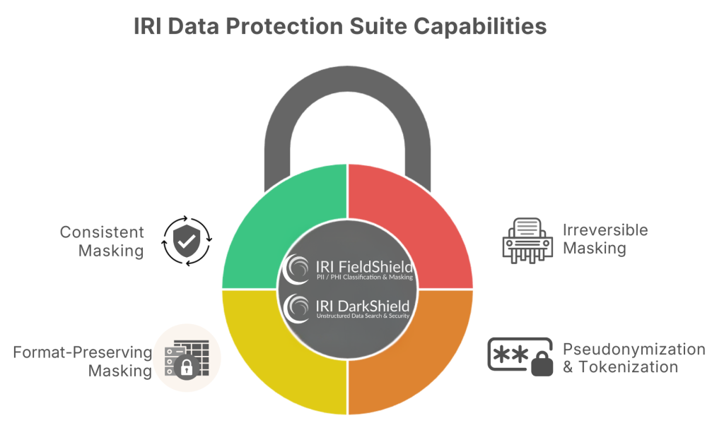 Tools in the IRI Data Protector Suite—namely, IRI FieldShield® and IRI DarkShield®—support: