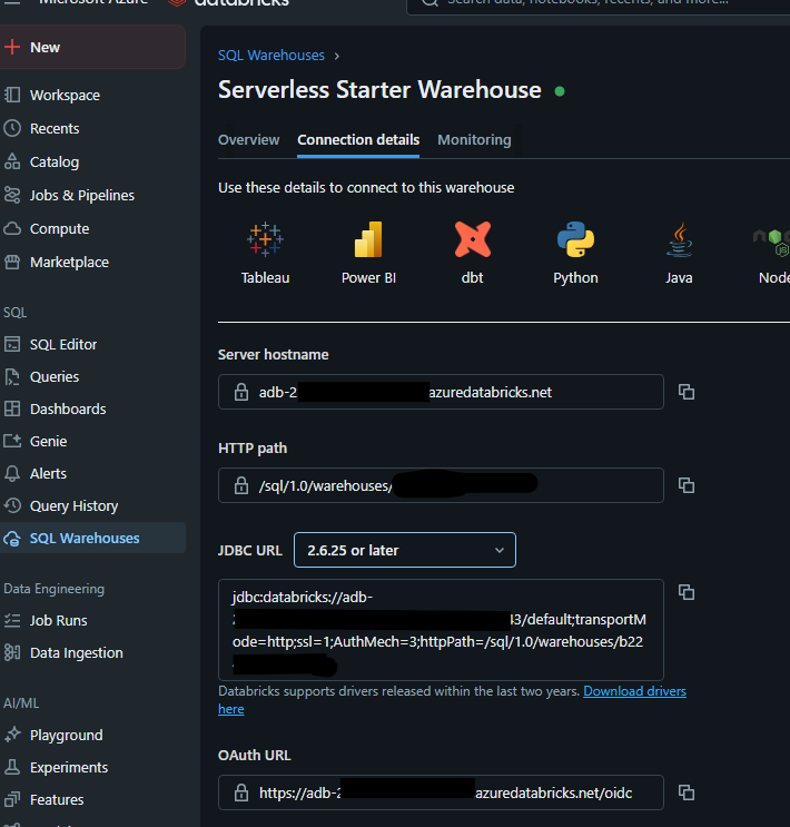 The image above shows the Databricks UI and where to find the JDBC properties to establish a connection. Note that the version of the JDBC driver downloaded dictates the JDBC URL format.