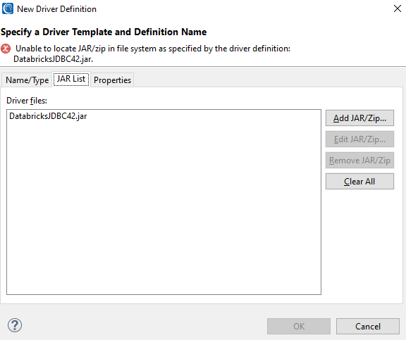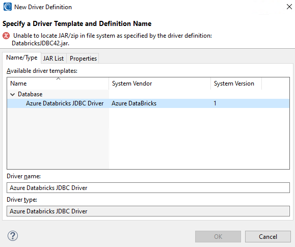 Select the Jar and then select the Edit JAR/ZIP… to open the file browser and select the JDBC jar file needed for Azure Databricks. After selecting the correct jar file, it will appear here; e.g.: