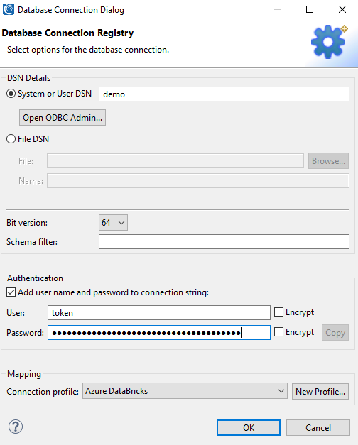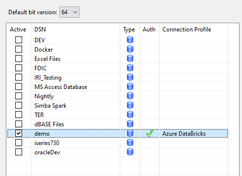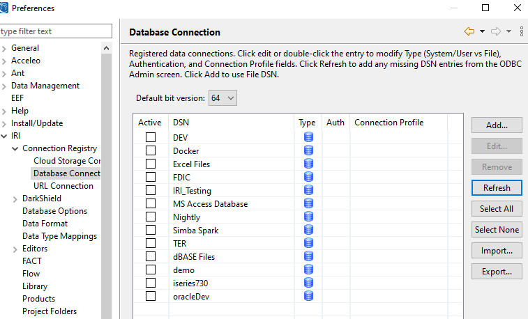 Select the twisty on Connection Registry and then select Database Connection. Verify the bit version is set to 64 and click Refresh to see all the ODBC connections available: