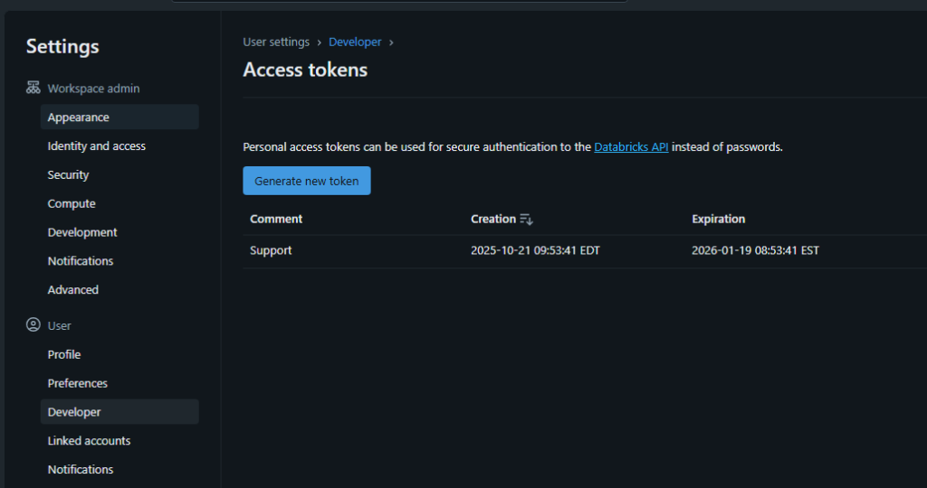 On the same page, in the top right-hand corner, there is an option to create an access token. This token will act like a password for users to log in. This example uses an access token.