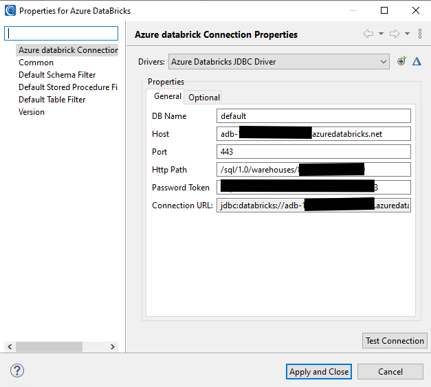 Specify all the properties in their respective text boxes. Leave the DB Name as default and click Test Connection to verify that Workbench can connect to the Databricks source.