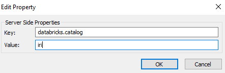 Here, the key is always databricks.catalog, and the value is the name of the catalog you want to connect to. Click OK until you are back to the main configuration page.
