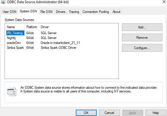 On the right-hand side of the window, select the Add… button and look for the Simba Spark ODBC Driver and select finish. This is the driver that will be used in order to create a connection to the Databricks source.