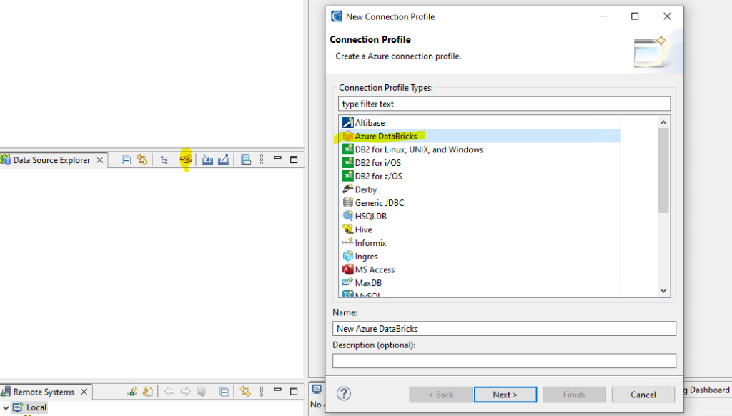 In the Data Source Explorer tab, select the new connection profile icon and select the Azure Databricks profile. (Image below for more context).